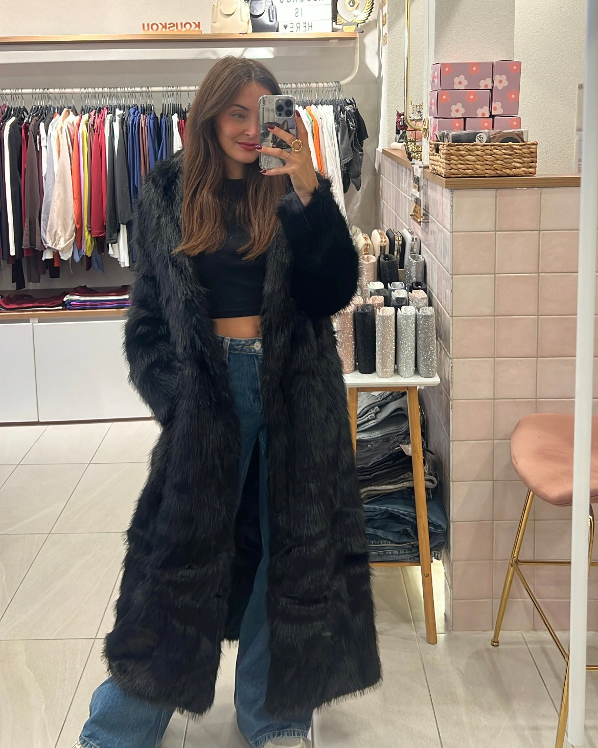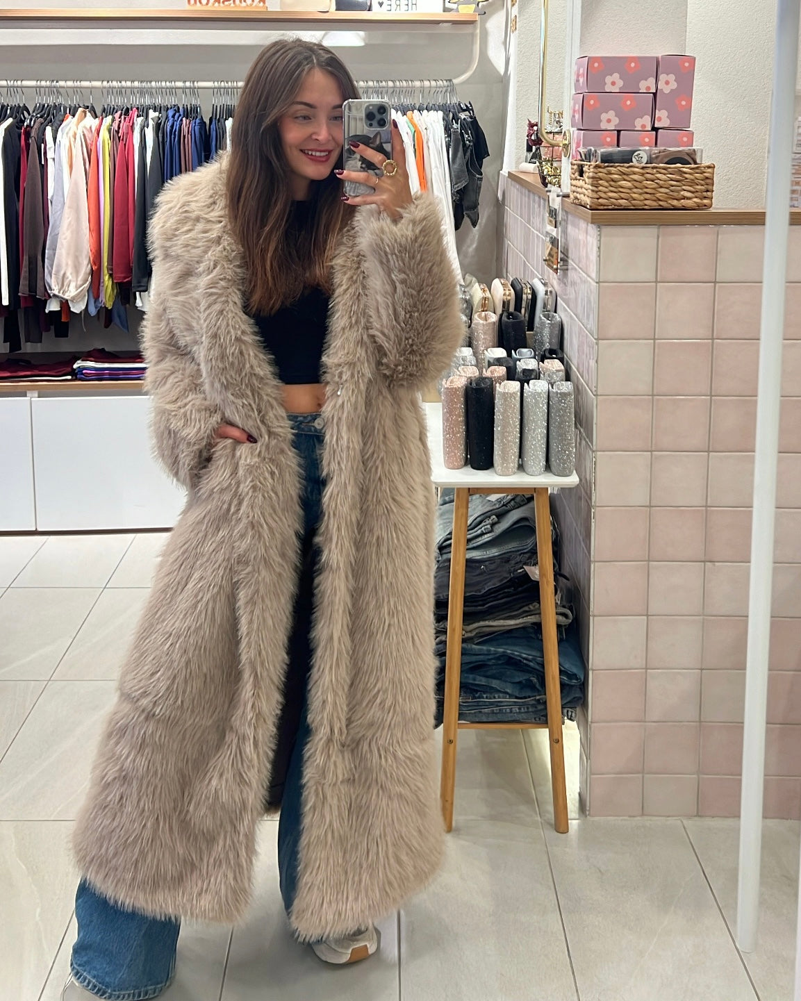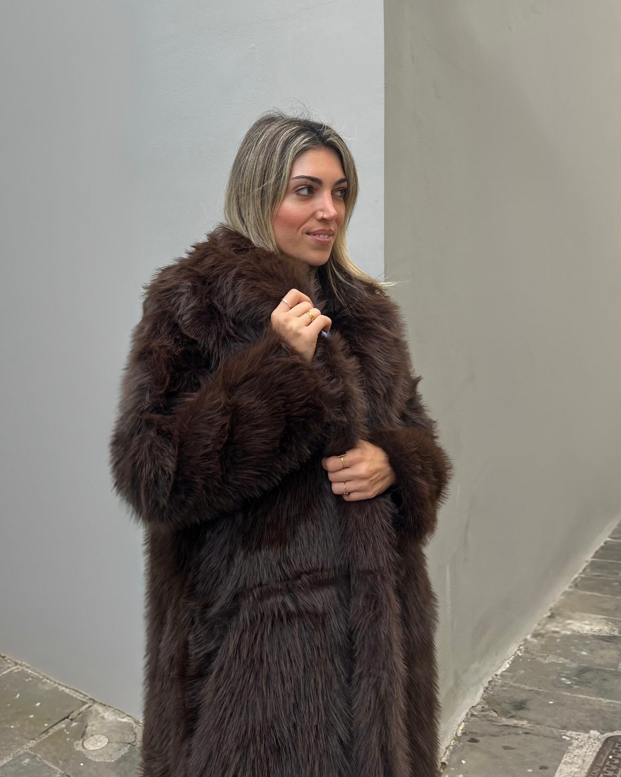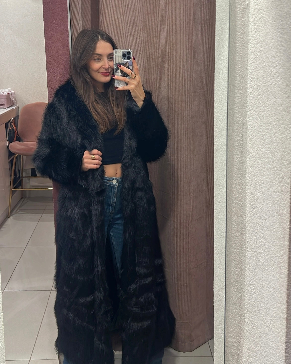 Μακριά γούνα με γιακά και κλείσιμο με clips