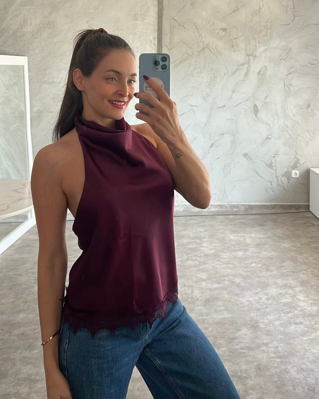 Σατινέ εξώπλατο τοπ με δαντέλα στο τελείωμα