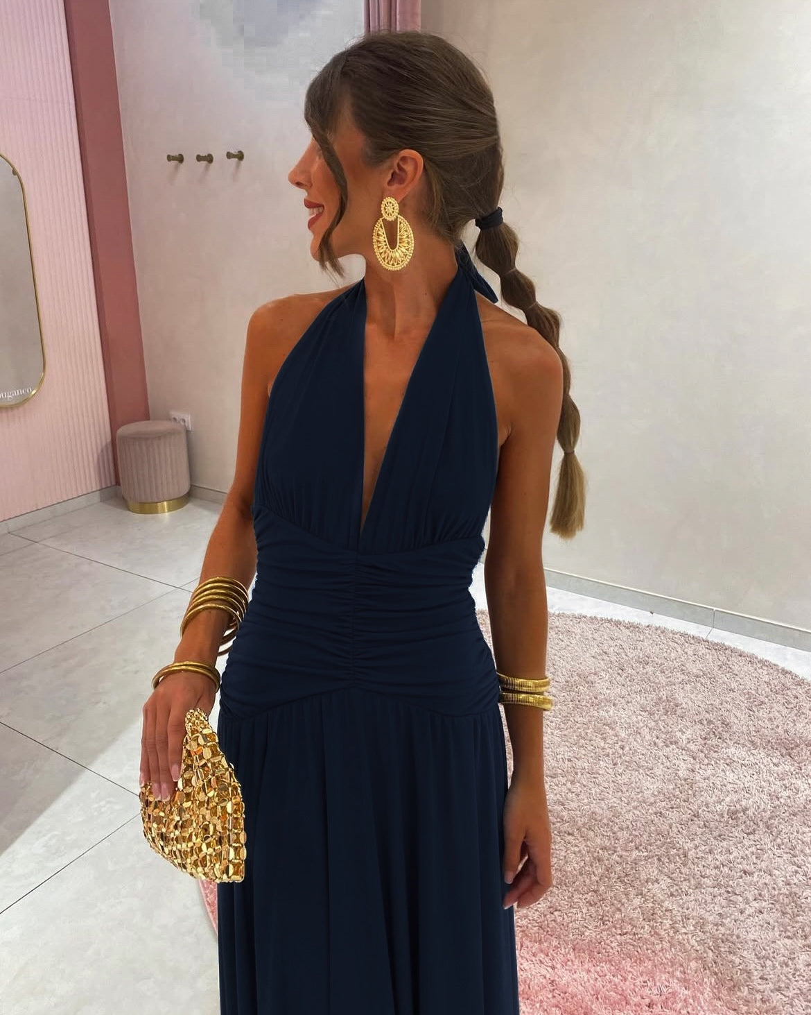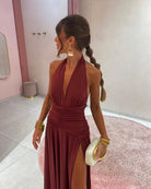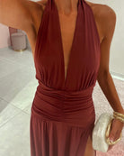 Maxi εξώπλατο φόρεμα με δέσιμο στο λαιμό και σούρα στη μέση