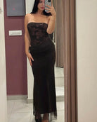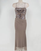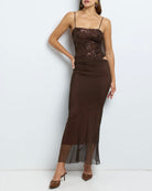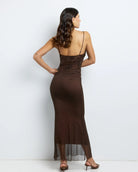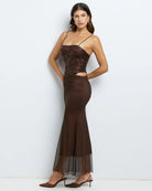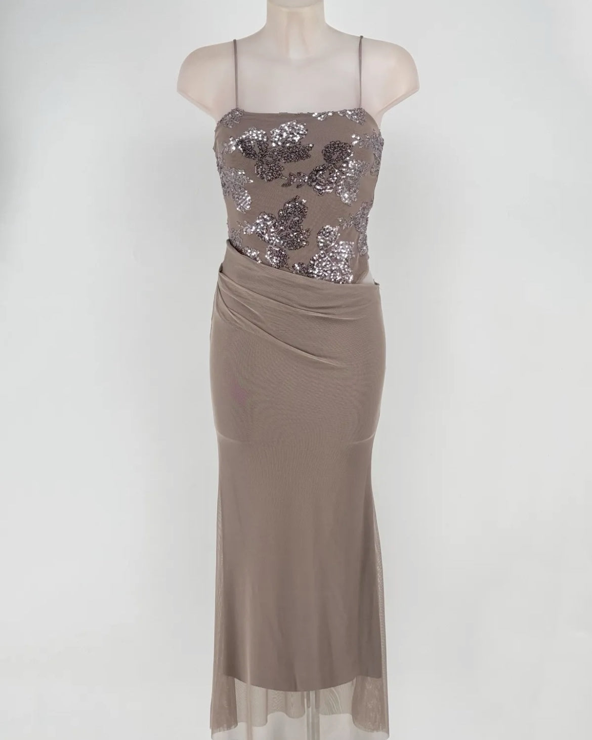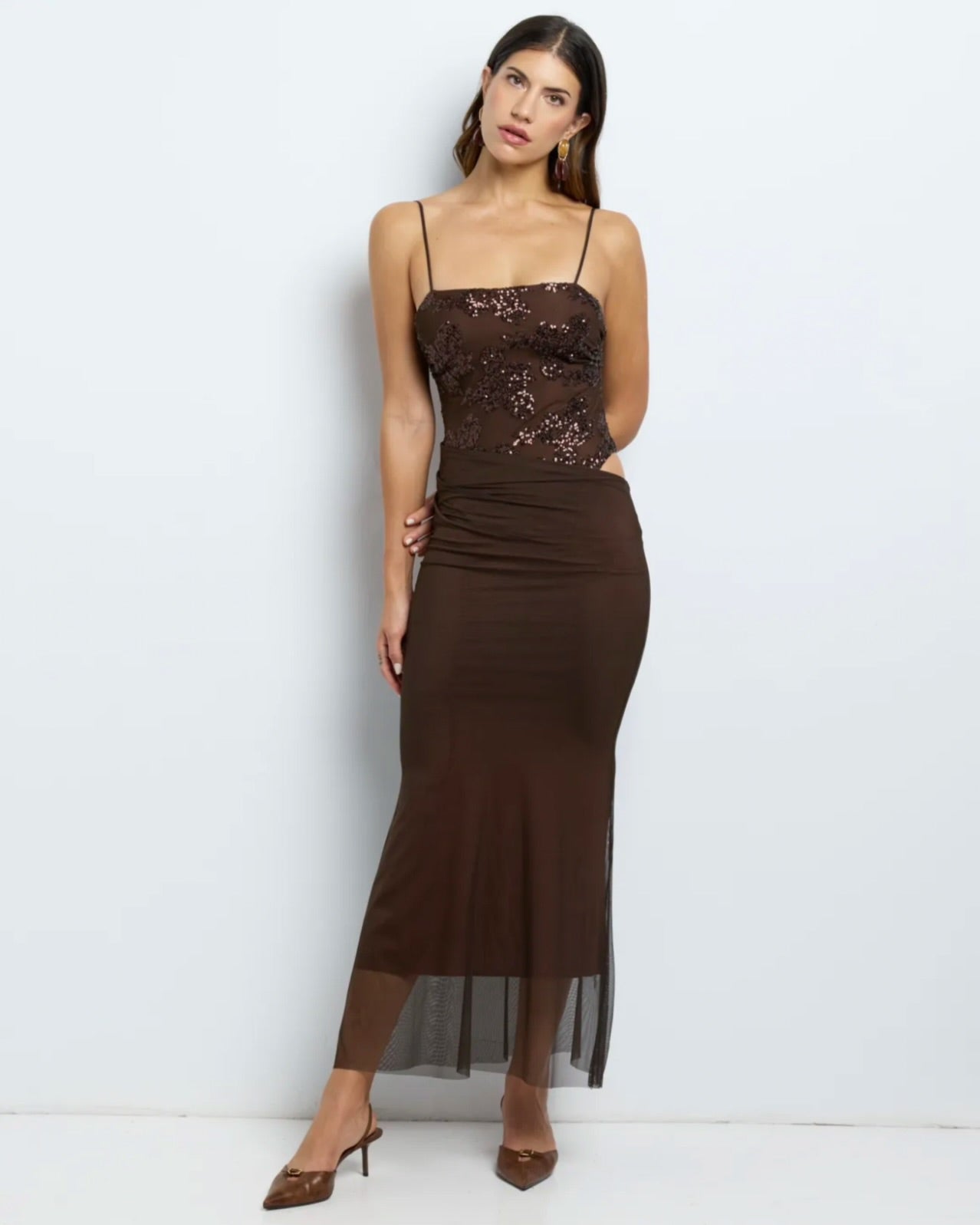 Maxi φόρεμα με ελαστικές ρυθμιζόμενες ράντες Αποτελείται από κορμάκι με πούλιες στο πάνω μέρος και φούστα με διαφάνεια