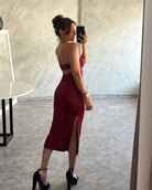 Midi strapless ελαστικό φόρεμα με άνοιγμα στο πόδι και στην πλάτη