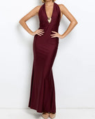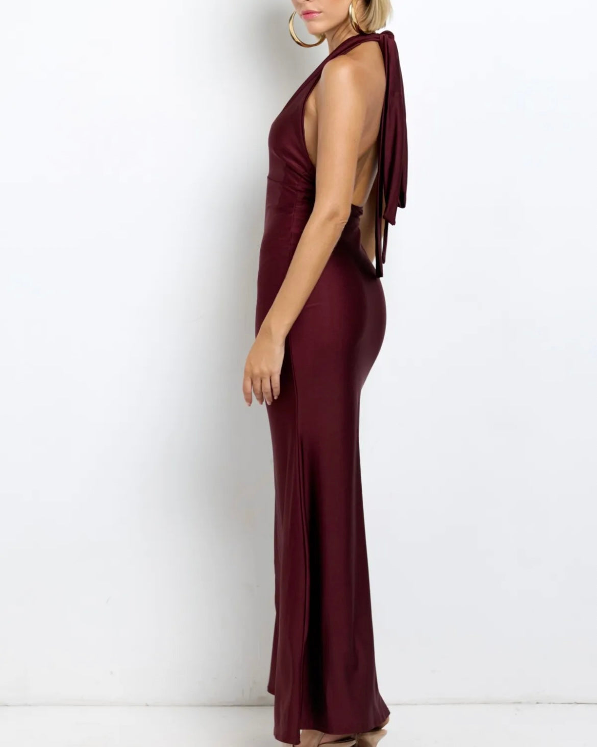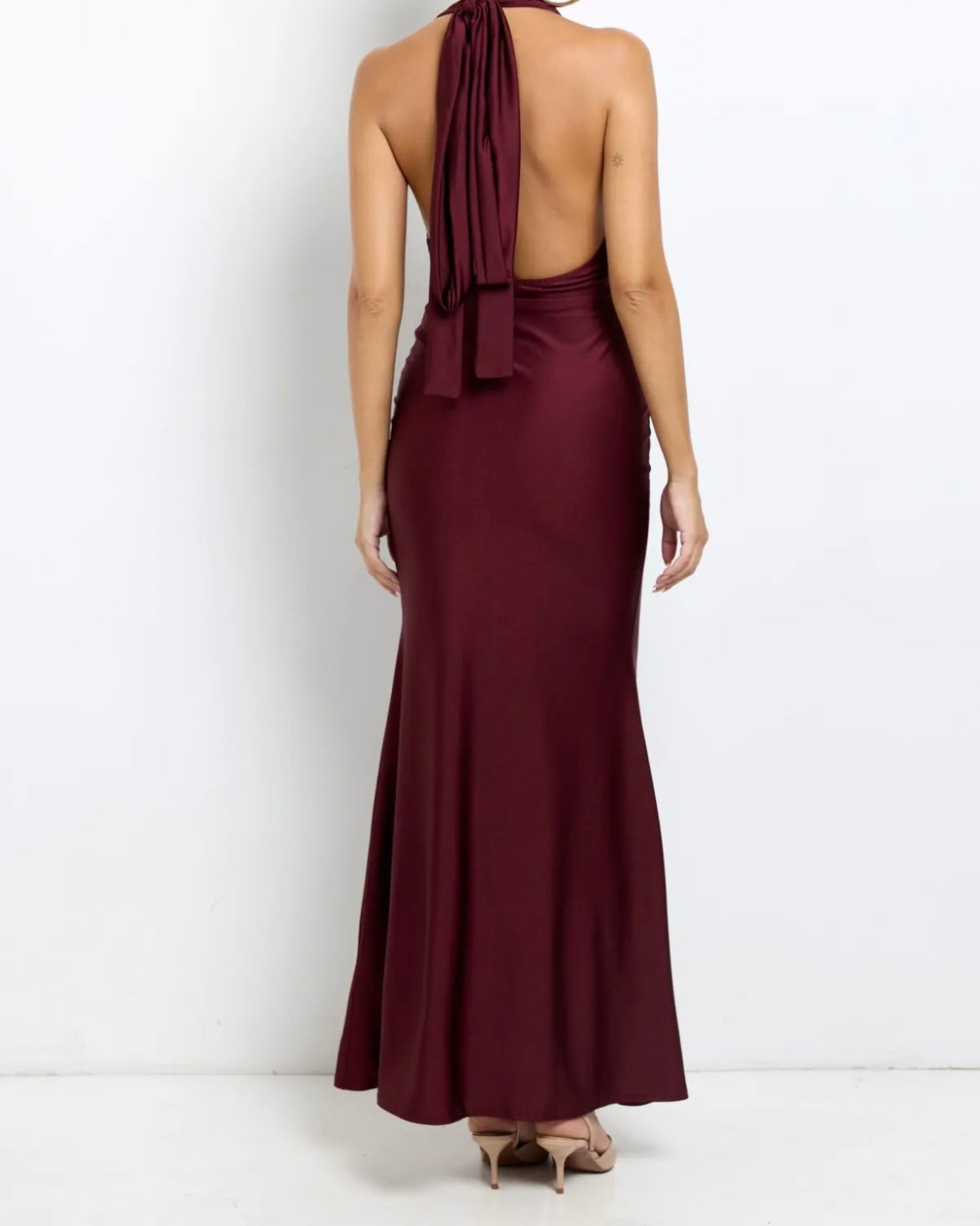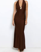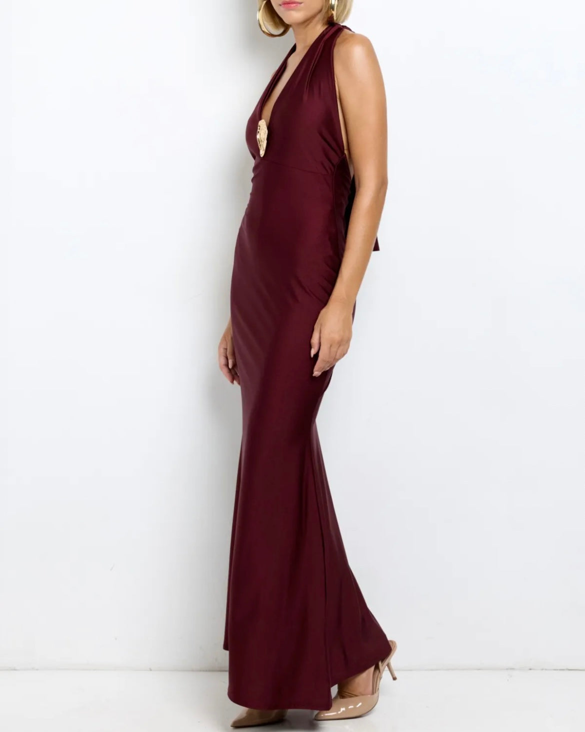 Maxi εξώπλατο φόρεμα με δέσιμο στο λαιμό και μεταλλική λεπτομέρεια στο στήθος