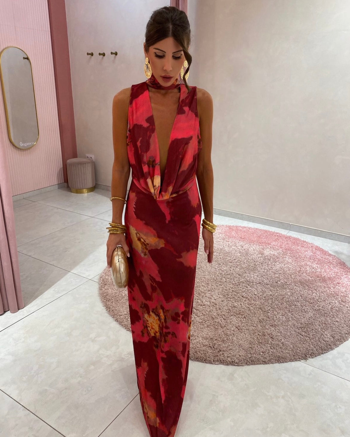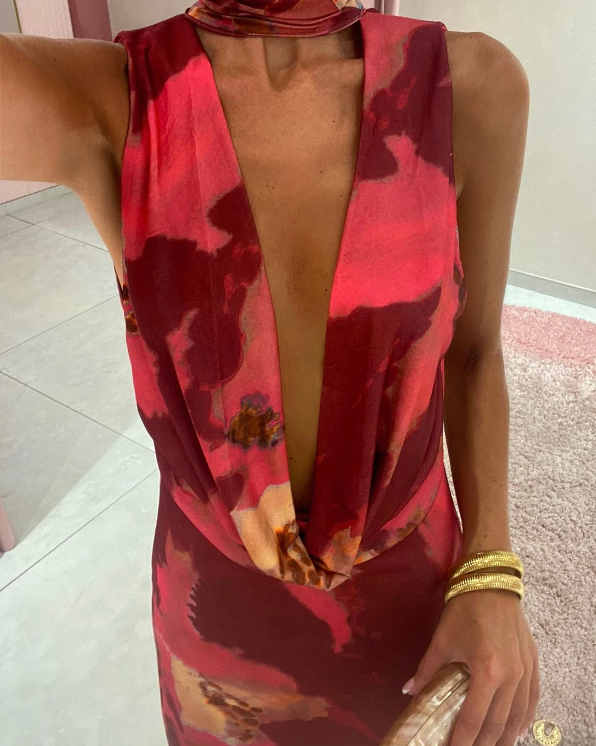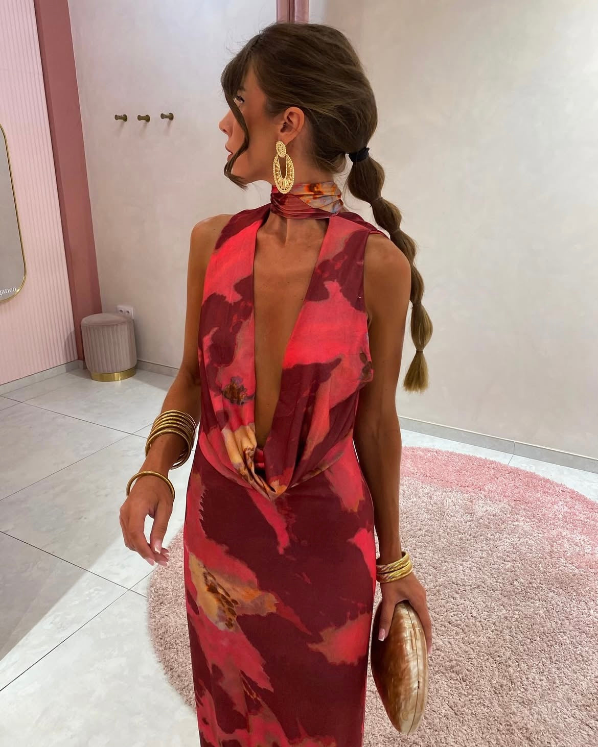 Maxi tie dye ντραπέ εξώπλατο φόρεμα με διακοσμητικό ύφασμα το λαιμό