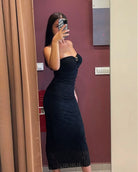Midi strapless δαντελένιο φόρεμα με διακοσμητική μεταλλική αγκράφα στο στήθος